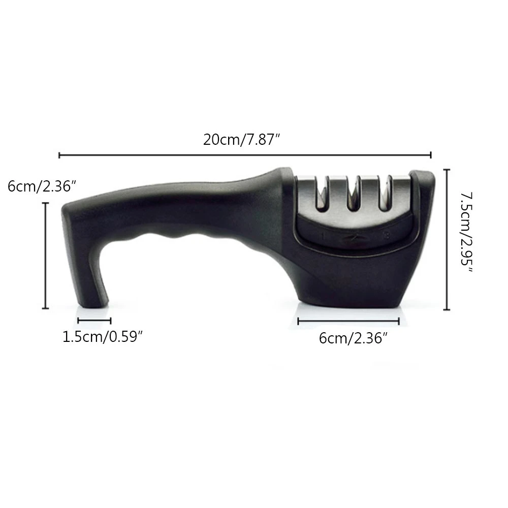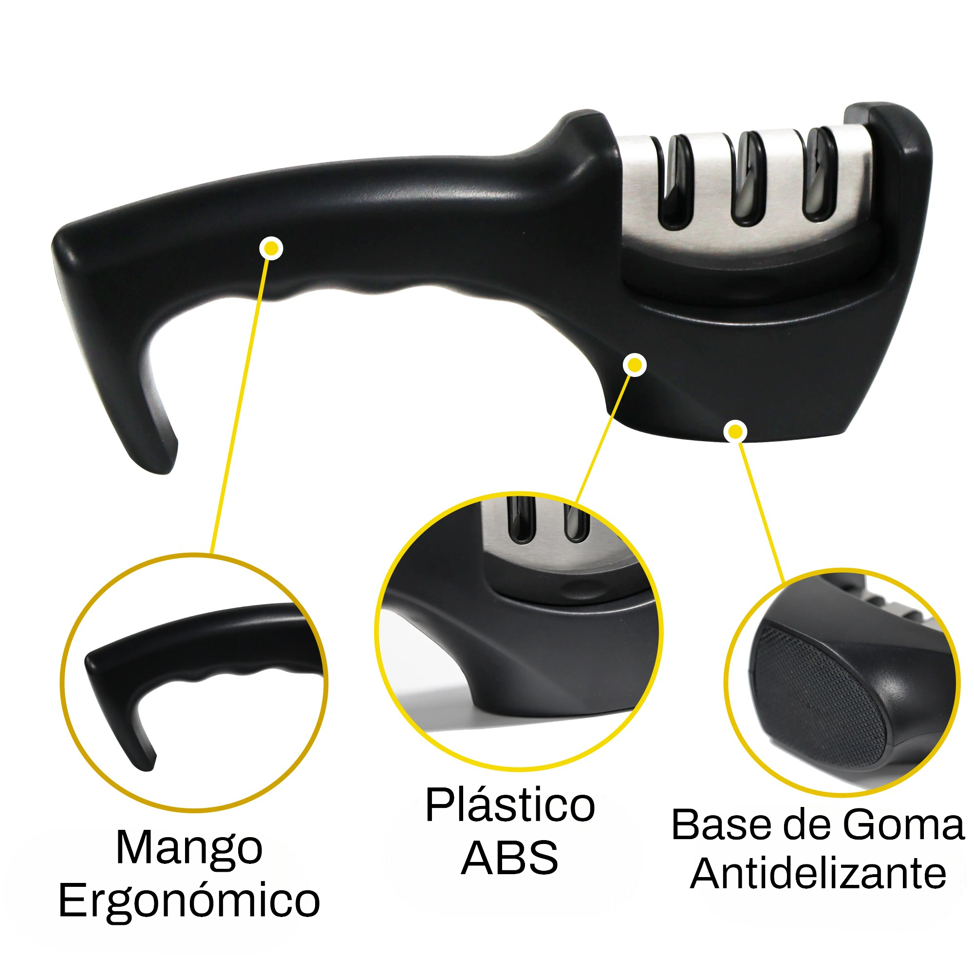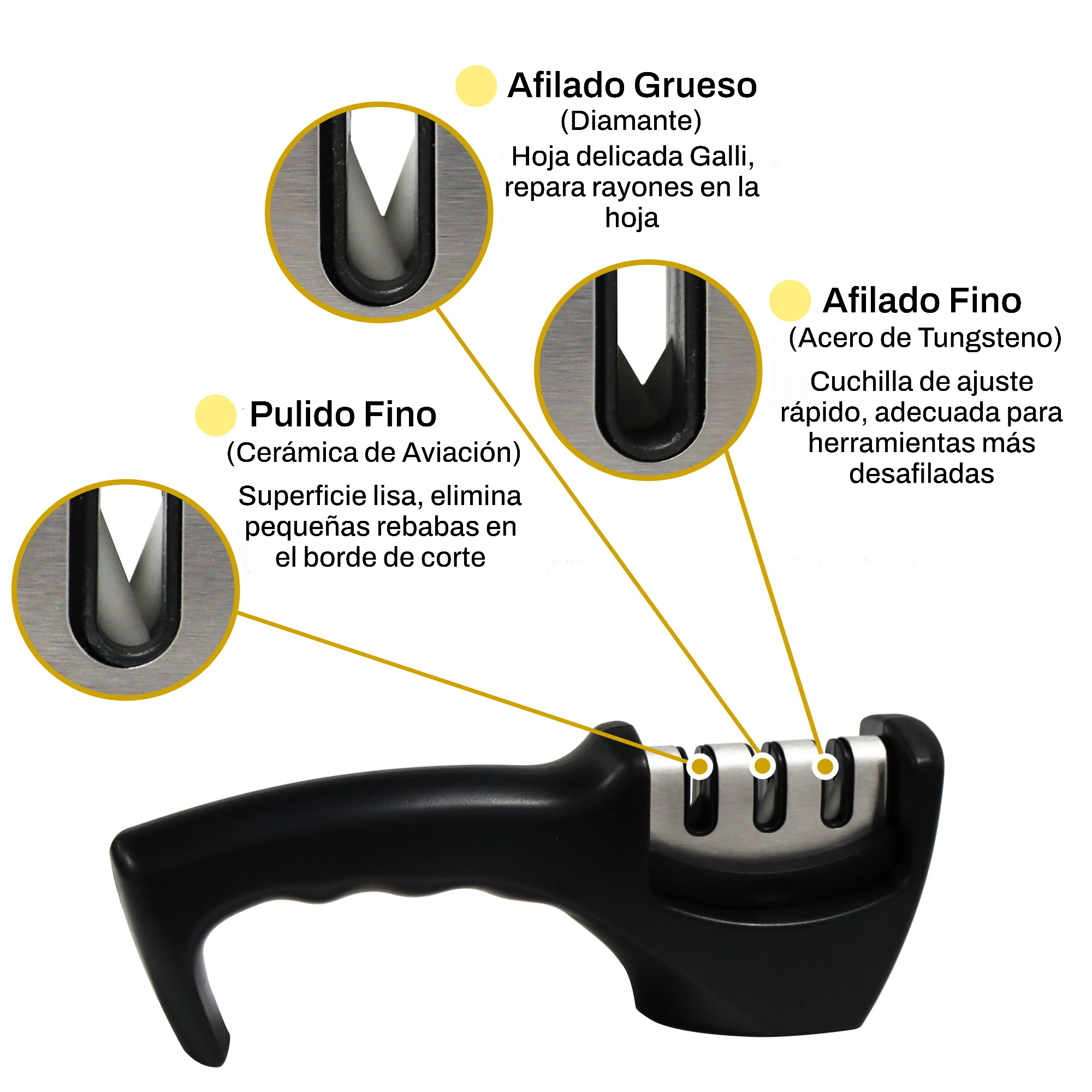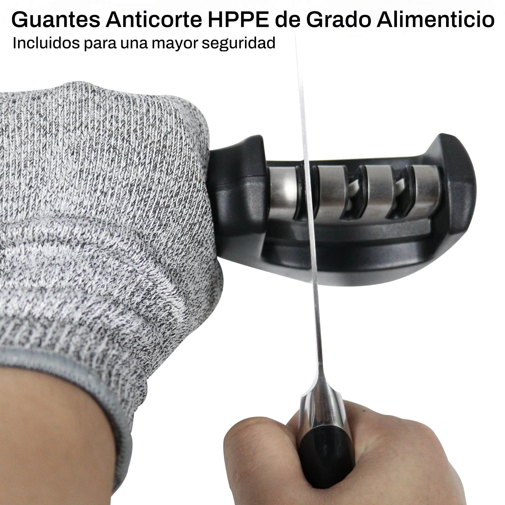 Mantén tus cuchillos siempre afilados y listos para cualquier preparación con este afilador de alta calidad. Su diseño cuenta con tres etapas de afilado, permitiéndote restaurar el filo y perfeccionarlo. 1) Cerámica: superficie lisa, elimina pequeñas rebabas en el filo. 2) Diamante: hoja de afilar delicada, repara rayones en la hoja. 3) Acero de tungsteno: hoja de fraguado rápido, adecuada para filos más desafilados. Es fácil de usar y seguro, perfecto para cocinas domésticas, además incluye un guante anticorte para aún mayor protección. Su mango ergonómico te permite usarlo seas diestro o zurdo, simplemente coloca la hoja en cada una de las ranuras y tira suavemente del cuchillo varias veces para un afilado rápido y efectivo. Disfruta de cortes precisos y evita el desgaste innecesario de tus cuchillos.